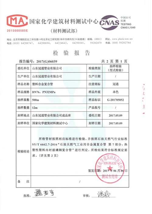 公司是《SY/T6662.7-2016石油天然氣工業用非金屬復合管第7部分:熱塑性塑料內襯玻璃鋼復合管》、《SY/T6770.3-2018非金屬管材質量驗收規范第3部分:熱塑性塑料內襯玻璃鋼復合管》、《SY/T6769.3-2018非金屬管道設計、施工及驗收規范第3部分:熱塑性塑料內襯玻璃鋼復合管》的行業標準起草單位之一。了解更多